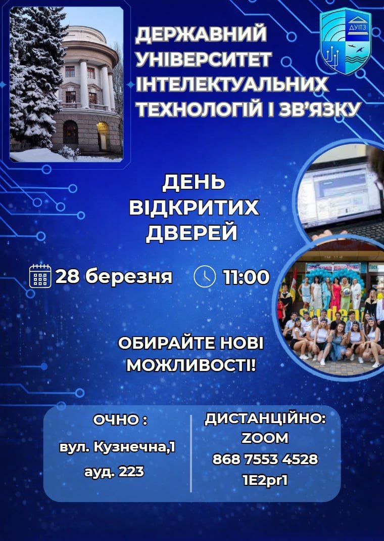 Державний університет інтелектуальних технологій і зв’язку запрошує майбутніх вступників на День відкритих дверей, який відбудеться 28 березня 2026 року о 11:00. Захід стане чудовою можливістю ближче познайомитися з університетом, його освітніми програмами та умовами вступу.